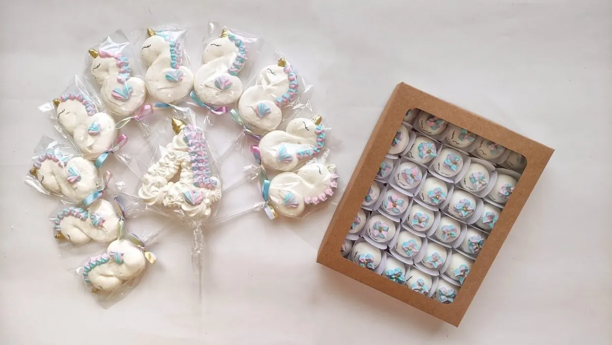• 30 Gotas de Unicórnio. • 10 Mini Suspirulitos . • 1 Topo de Bolo.