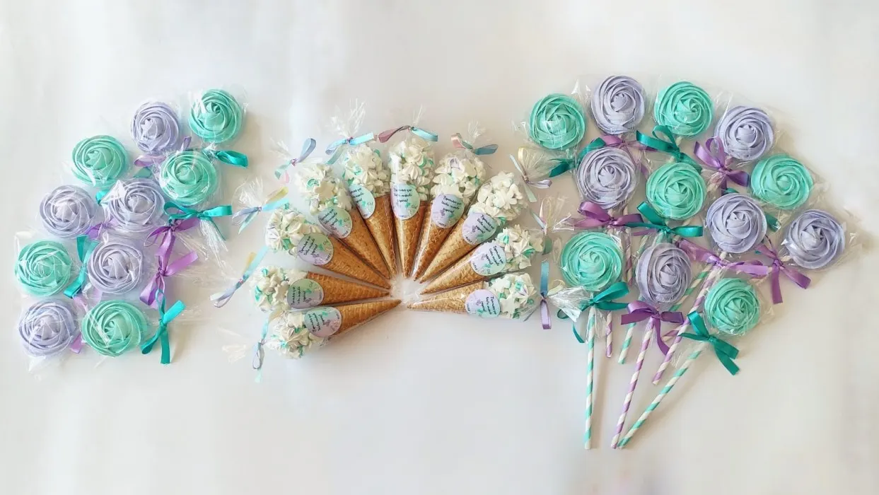 • 10 Cones de Suspiro Tradicional. • 12 Suspirulitos Grandes. • 10 Mini Suspirulitos. Tema Chá Revelação