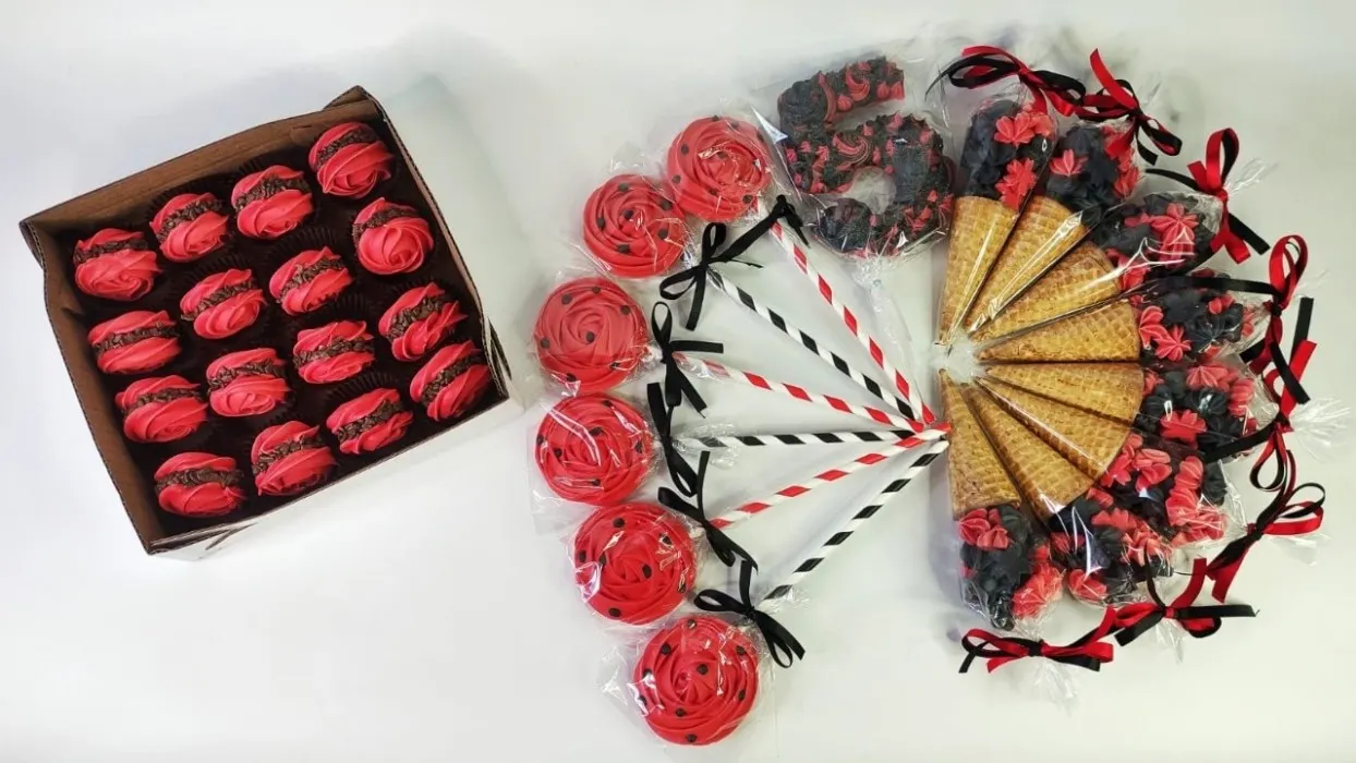 • 15 Cones de Suspiro Tradicional. • 15 Suspirulitos Grandes. • 16 Bem Suspirados de Brigadeiro Tradicional. • 1 Topo de Bolo. Tudo no tema da sua festa.